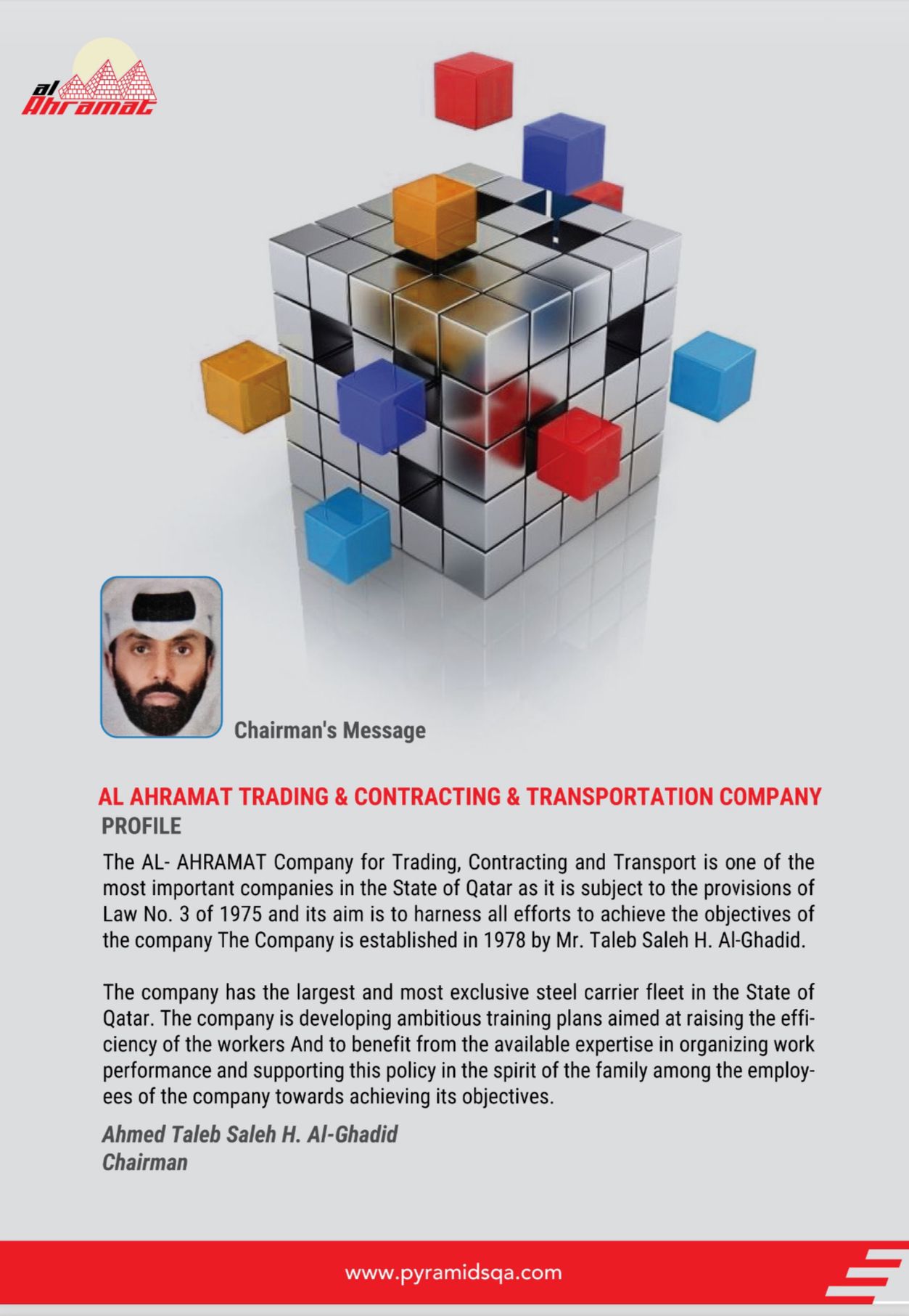 Al-Ahramat Company for Trading, Contracting, and Transportation is considered one of the leading companies in the State of Qatar, enhancing its position by providing distinguished services that align with market needs. The company was established in 1978 by Mr. Taleb Saleh H. Al-Ghadid and is committed to implementing the provisions of Law No. 3 of 1975 to achieve its strategic objectives.